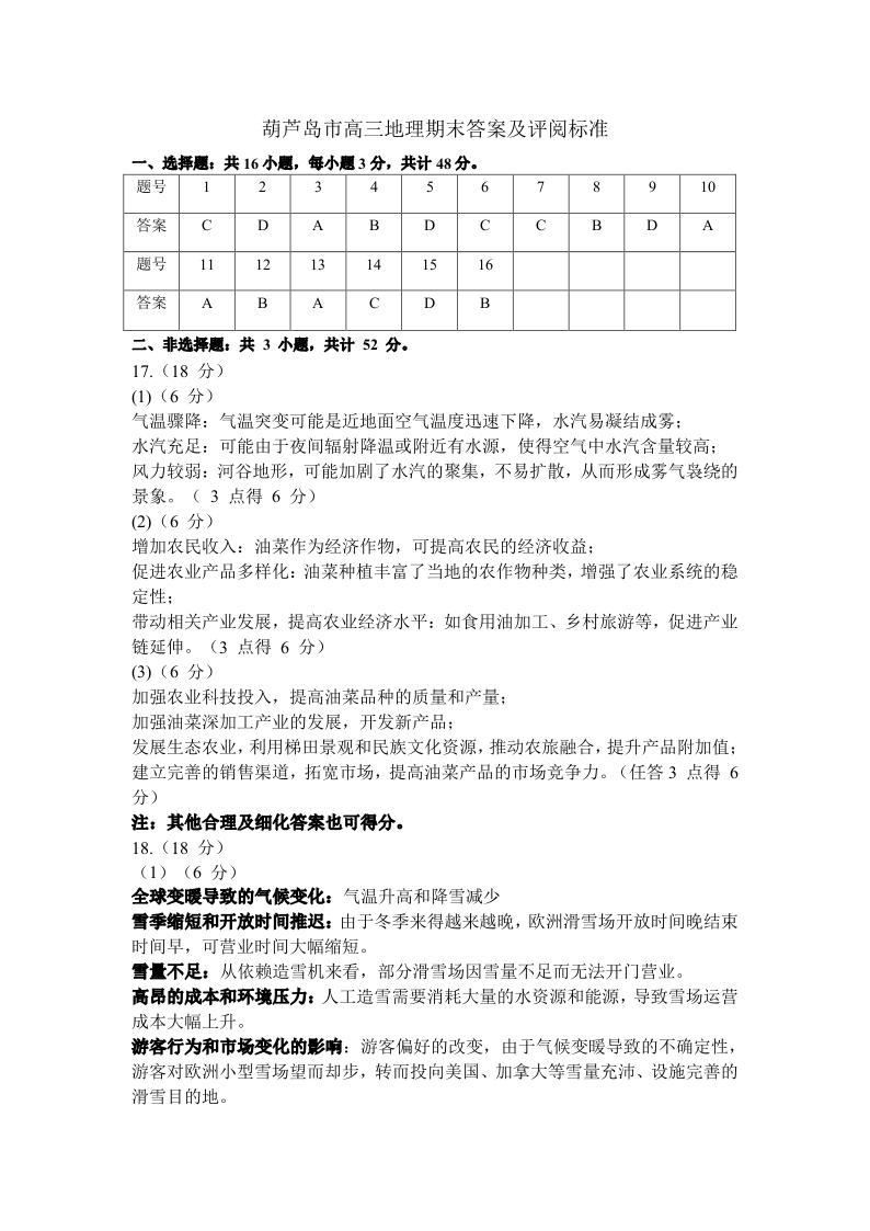 辽宁省葫芦岛市2025届高三上学期1月期末考试 地理参考答案.pdf