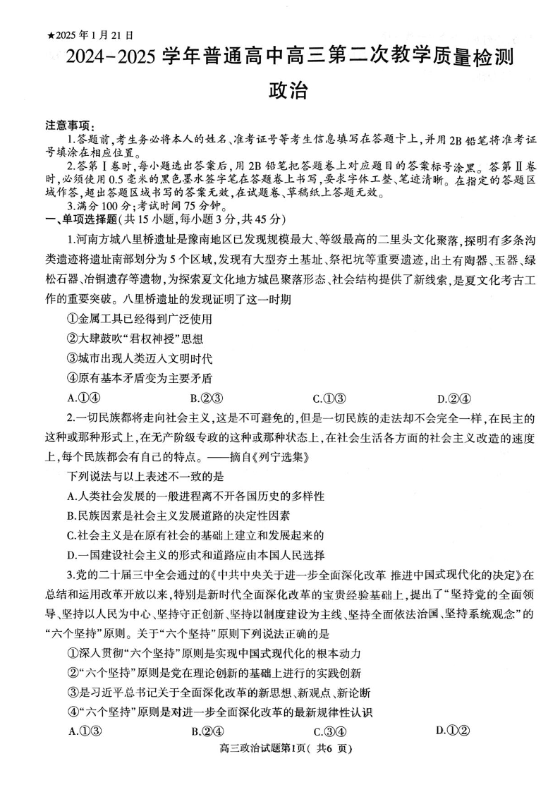 河南省信阳市2024-2025学年高三第二次教学质量检测 政治.pdf