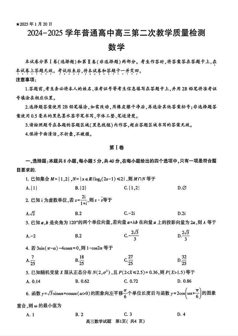 河南省信阳市2024-2025学年高三第二次教学质量检测 数学.pdf
