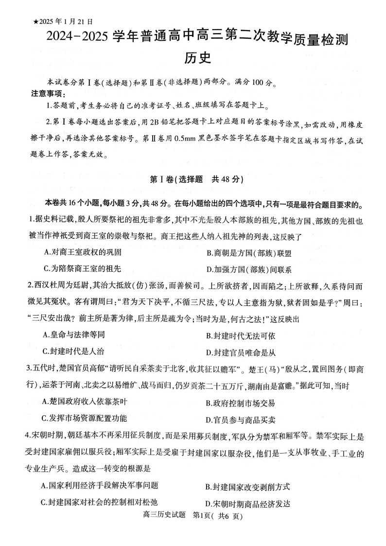 河南省信阳市2024-2025学年高三第二次教学质量检测 历史.pdf