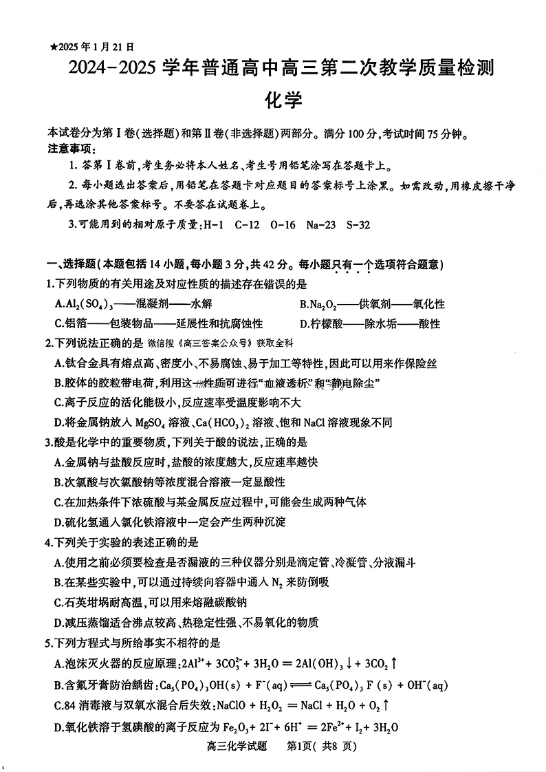 河南省信阳市2024-2025学年高三第二次教学质量检测 化学.pdf