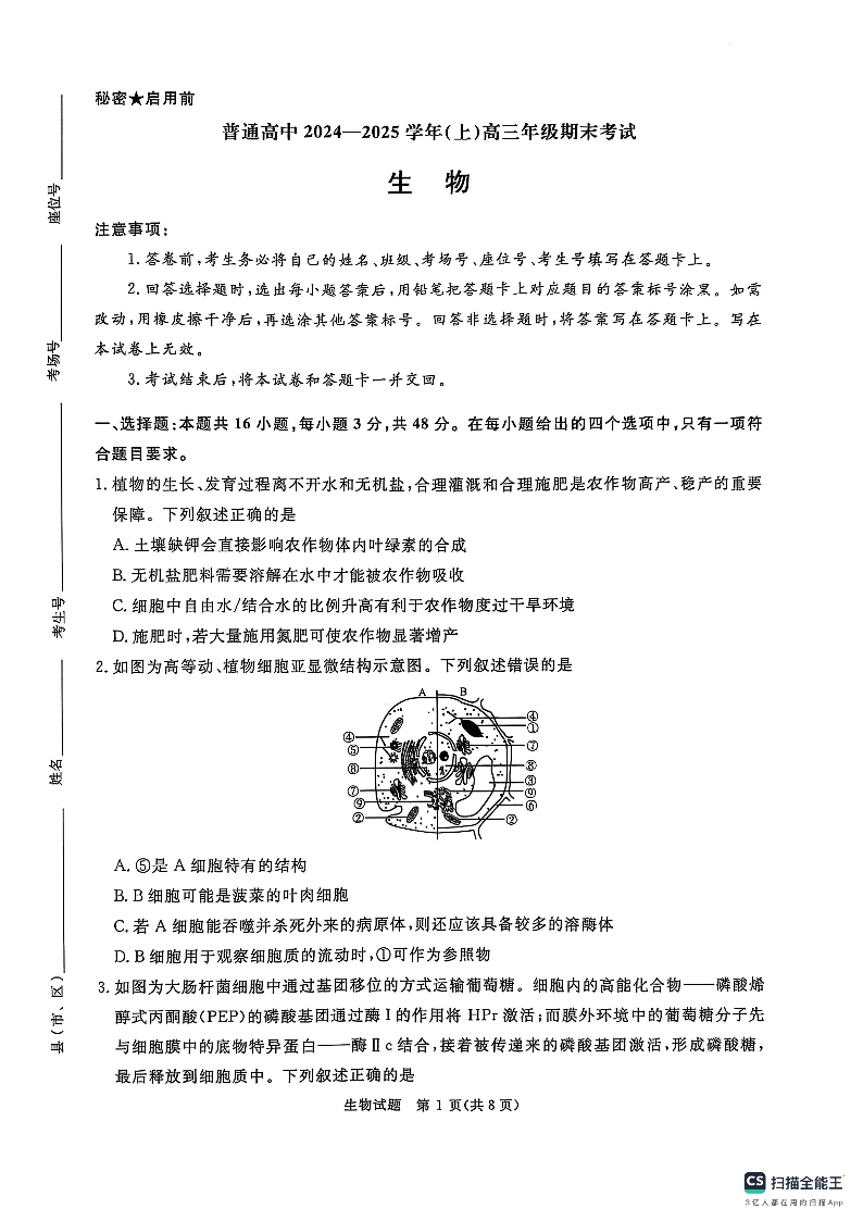 河南省普通高中2025届高三上学期1月青桐鸣期末大联考 生物.pdf