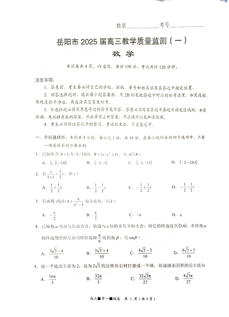湖南省岳阳市2025届高三上学期教学质量监测(一)数学.pdf