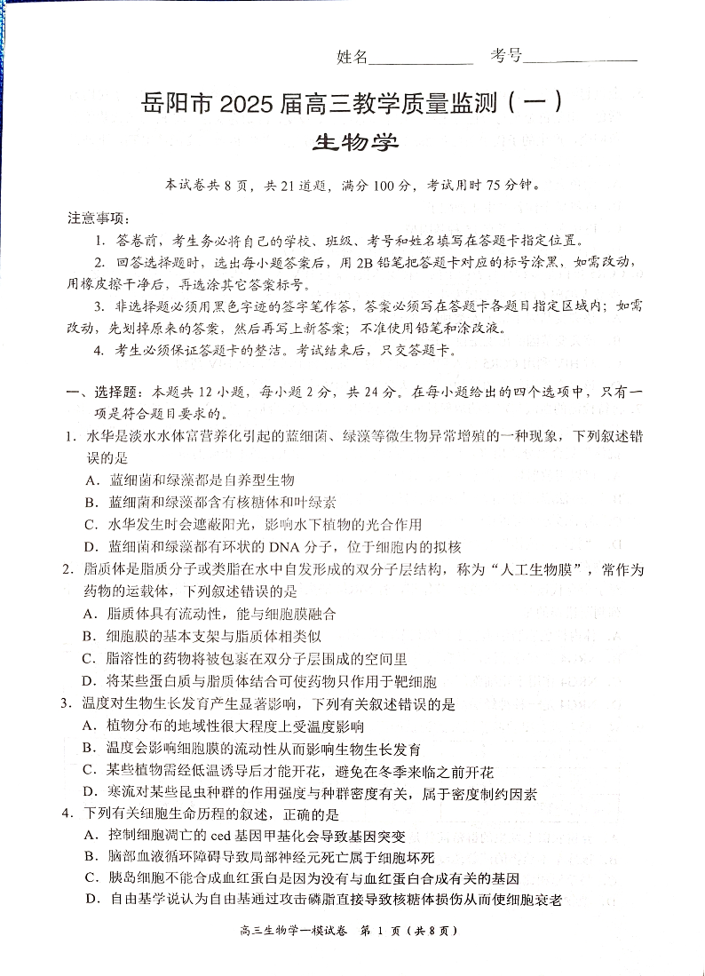 湖南省岳阳市2025届高三上学期教学质量监测(一)生物.pdf