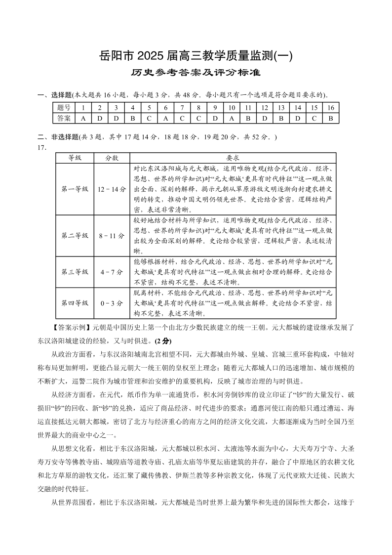湖南省岳阳市2025届高三上学期教学质量监测(一)历史答案.pdf