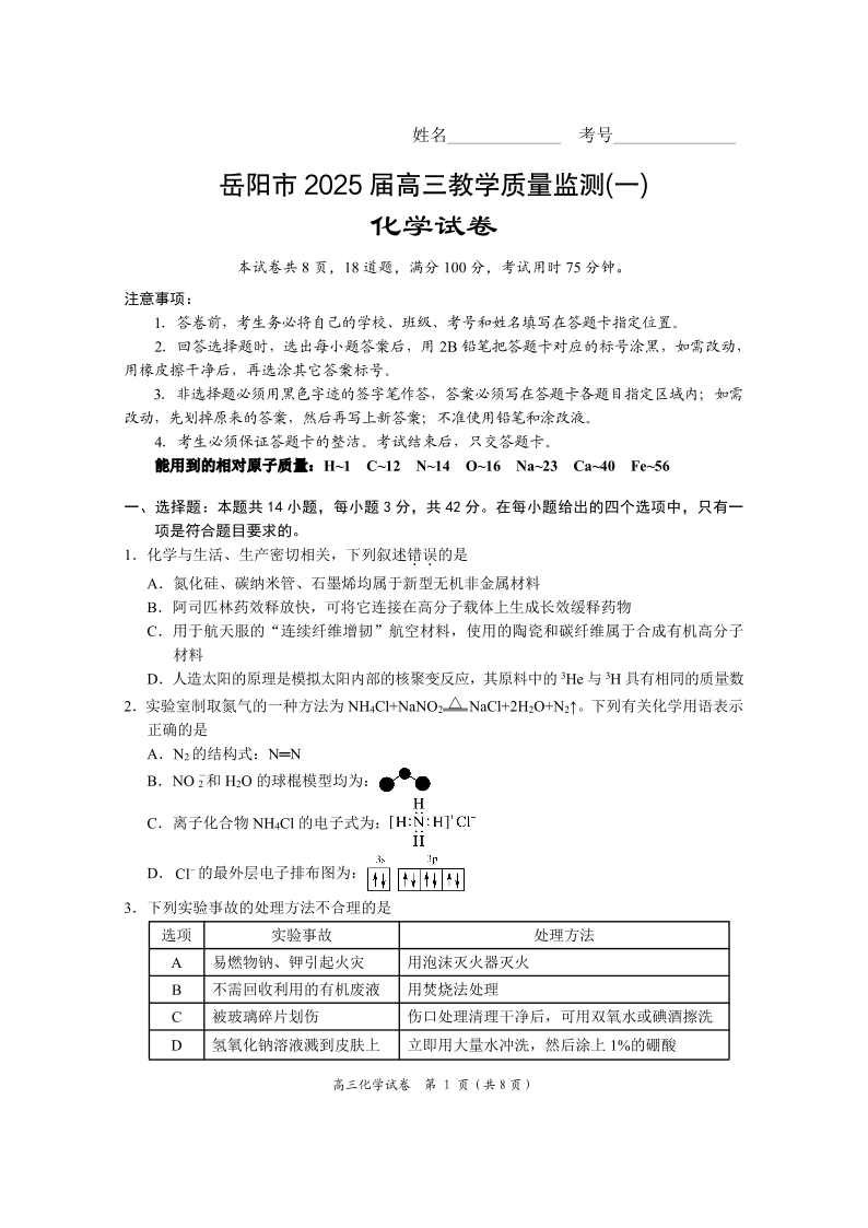 湖南省岳阳市2025届高三上学期教学质量监测(一)化学.pdf
