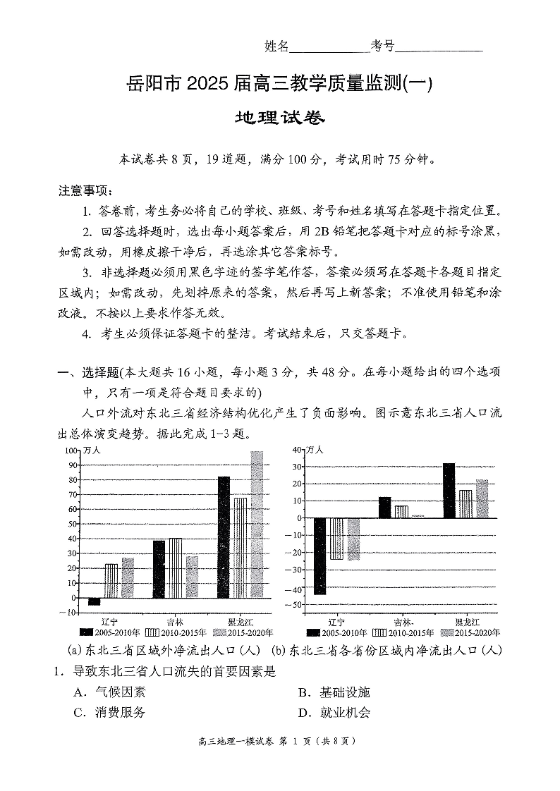 湖南省岳阳市2025届高三上学期教学质量监测(一)地理.pdf