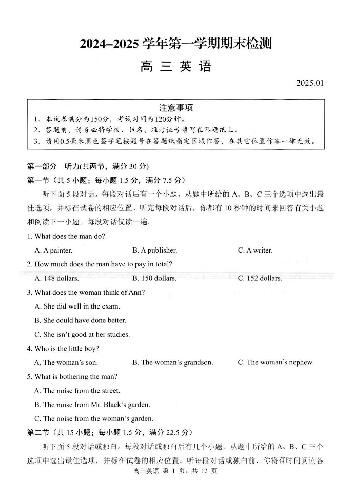 江苏省省扬州市2024-2025学年高三(上)学期期末检测 英语.pdf