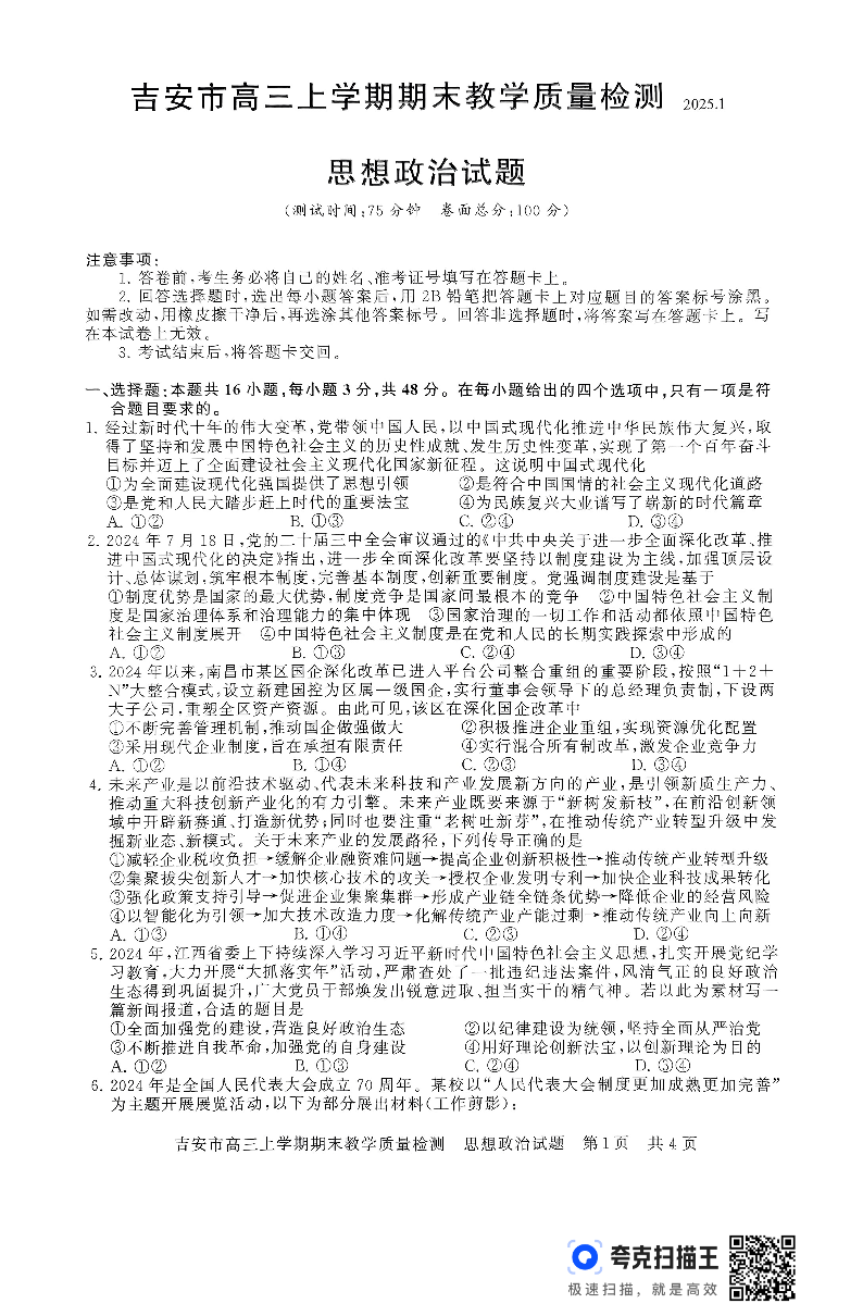 江西省吉安市2025届高三上学期1月期末教学质量检测 政治(含答案).pdf