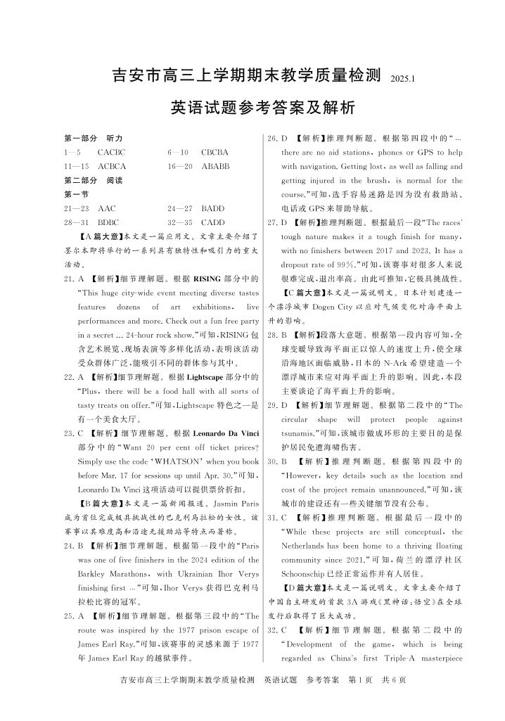 江西省吉安市2025届高三上学期1月期末教学质量检测 英语答案.pdf