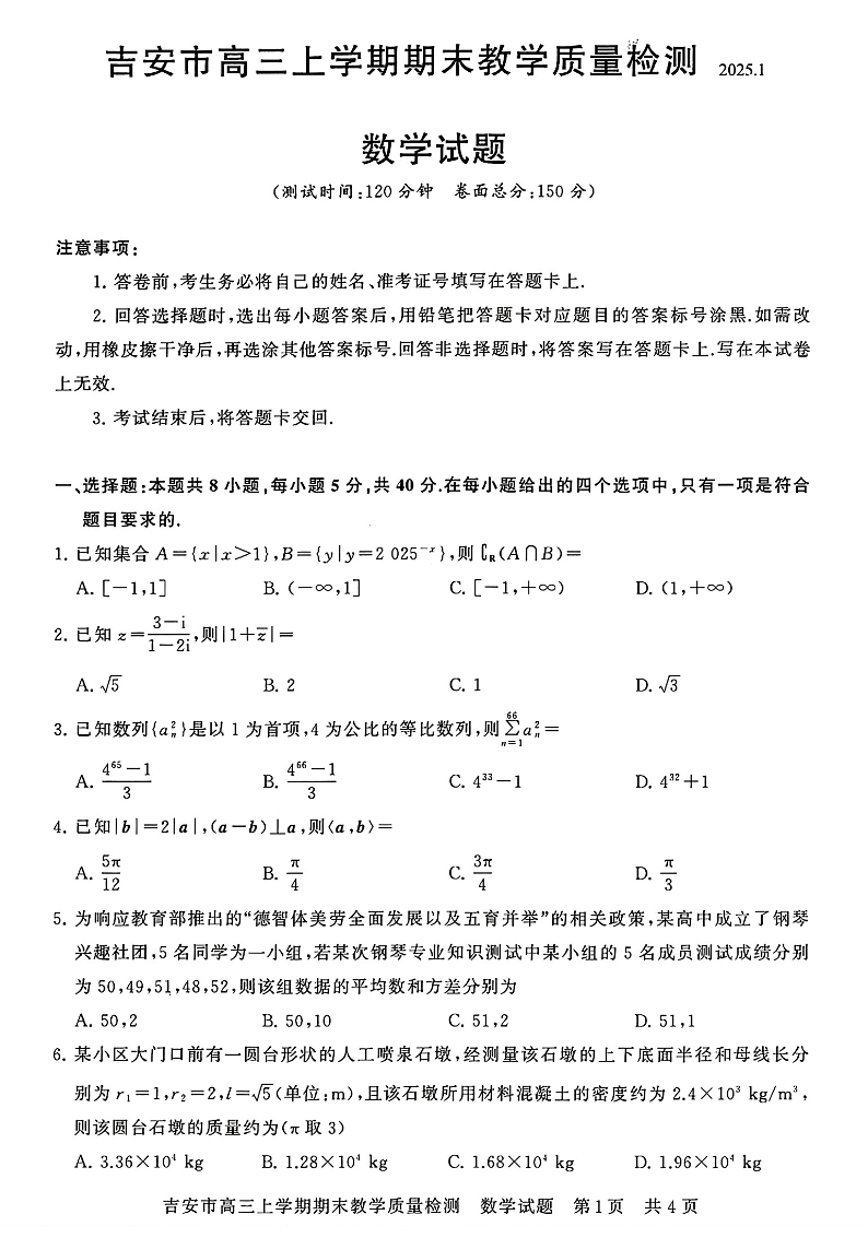 江西省吉安市2025届高三上学期1月期末教学质量检测 数学.pdf