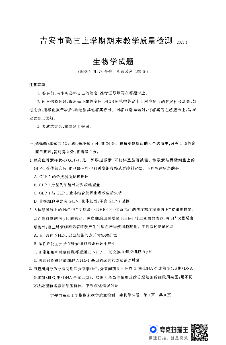 江西省吉安市2025届高三上学期1月期末教学质量检测 生物(含答案).pdf