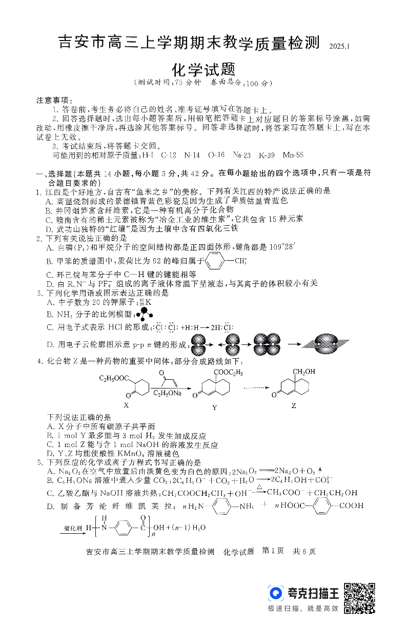 江西省吉安市2025届高三上学期1月期末教学质量检测 化学(含答案).pdf