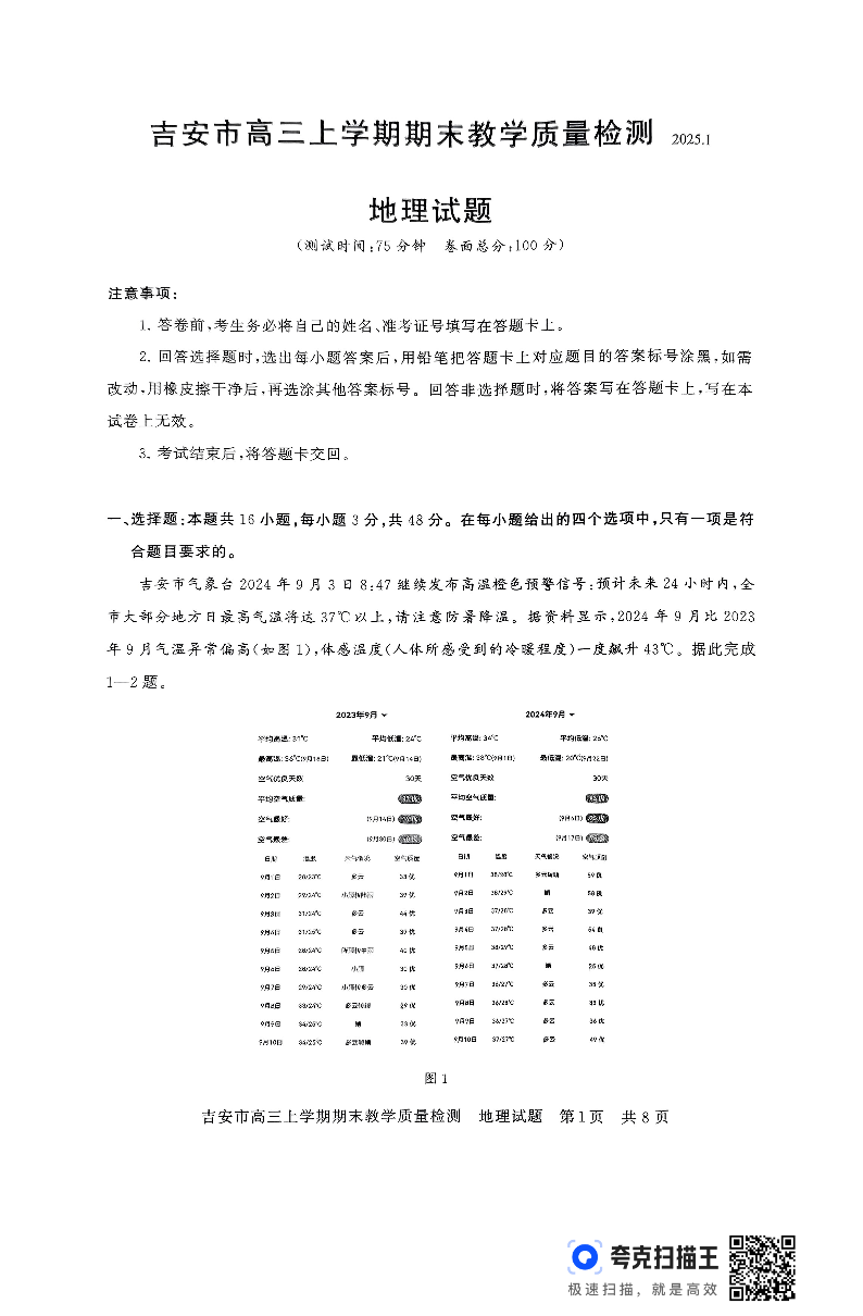 江西省吉安市2025届高三上学期1月期末教学质量检测 地理(含答案).pdf