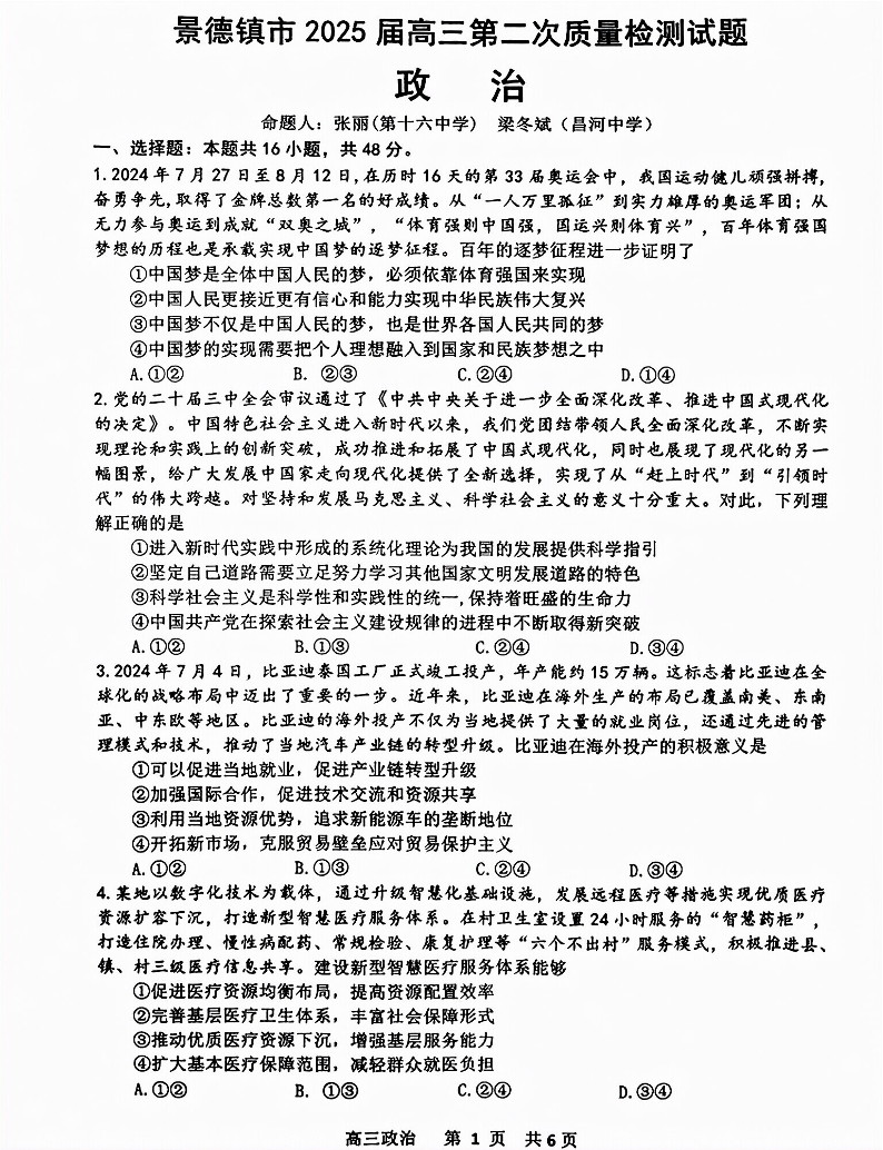 景德镇市2025届高三第二次质量检测(景德镇二检)政治.pdf