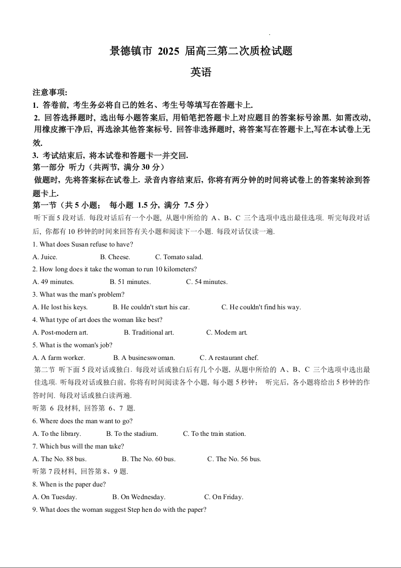 景德镇市2025届高三第二次质量检测(景德镇二检)英语.docx