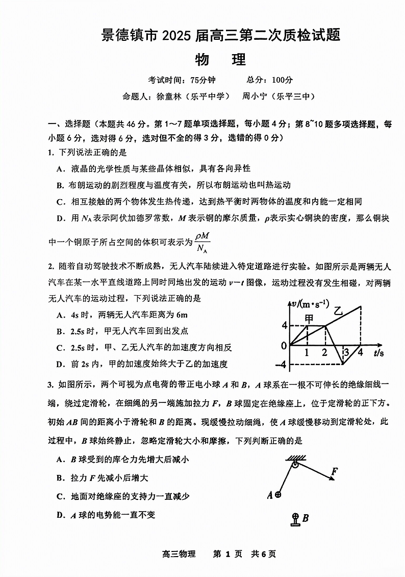 景德镇市2025届高三第二次质量检测(景德镇二检)物理.pdf