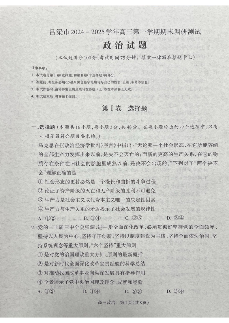 山西省吕梁市2024-2025学年高三上学期期末考试 政治.pdf