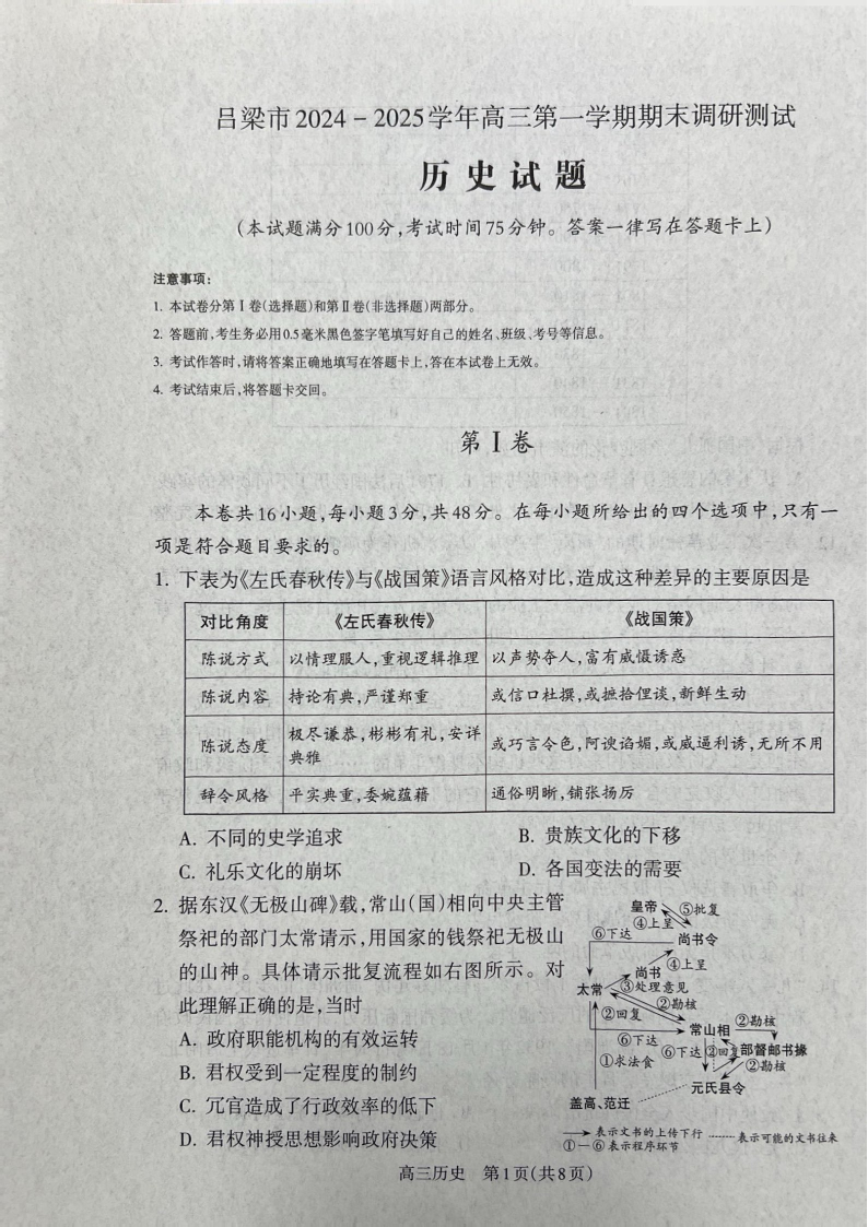 山西省吕梁市2024-2025学年高三上学期期末考试 历史.pdf