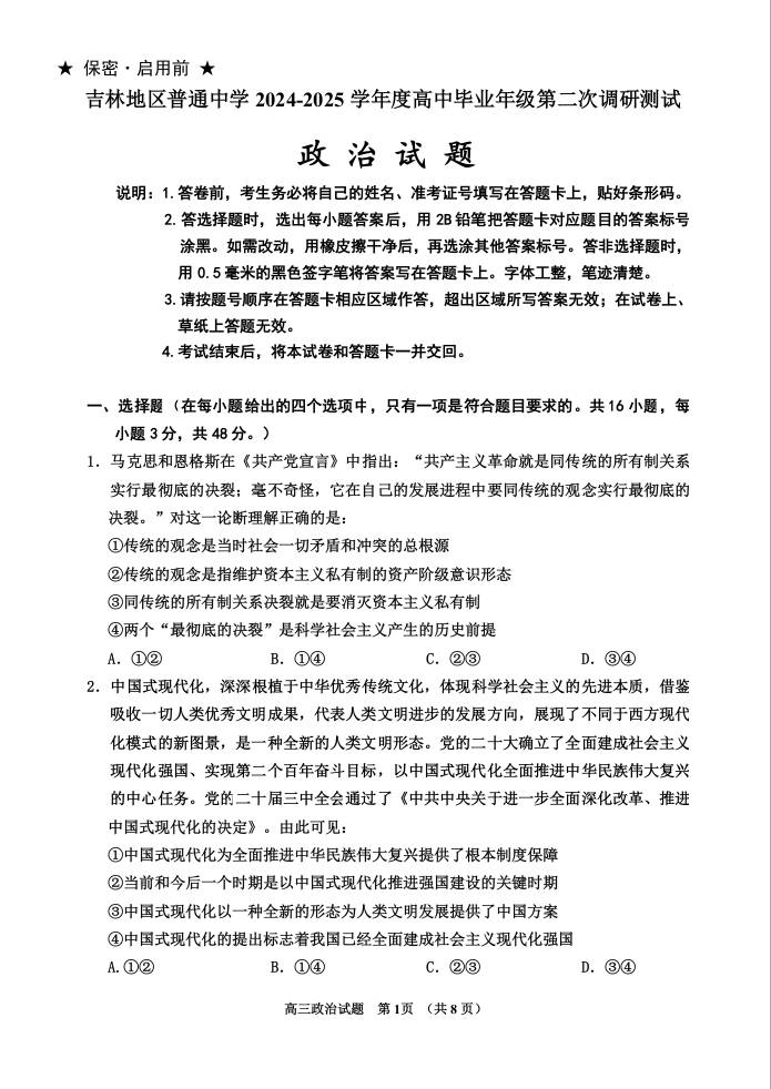 吉林省普通中学2025届高三上学期第二次调研测试 政治.doc