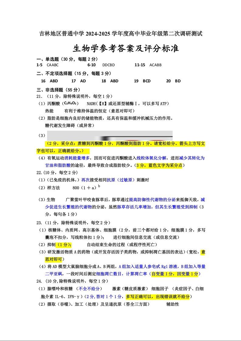 吉林省普通中学2025届高三上学期第二次调研测试 生物答案.docx