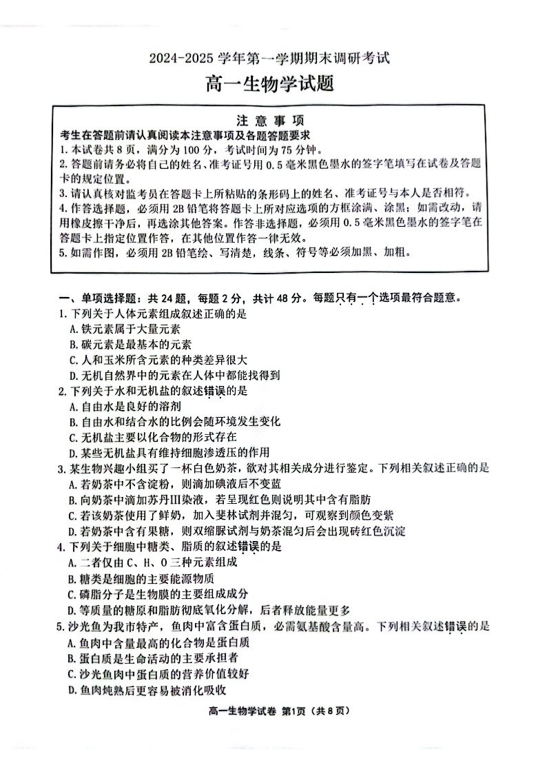 【生物+答案】25年1月连云港高一期末考卷.pdf