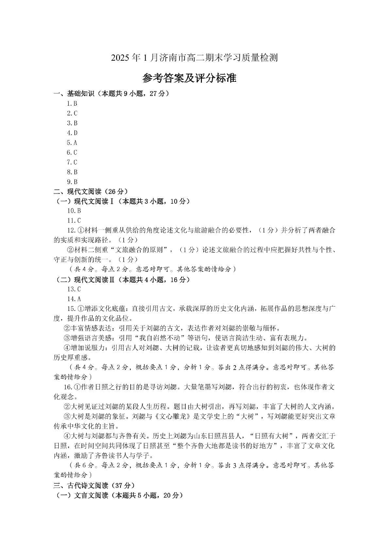 2025年1月济南市高二期末学习质量检测 语文答案.pdf