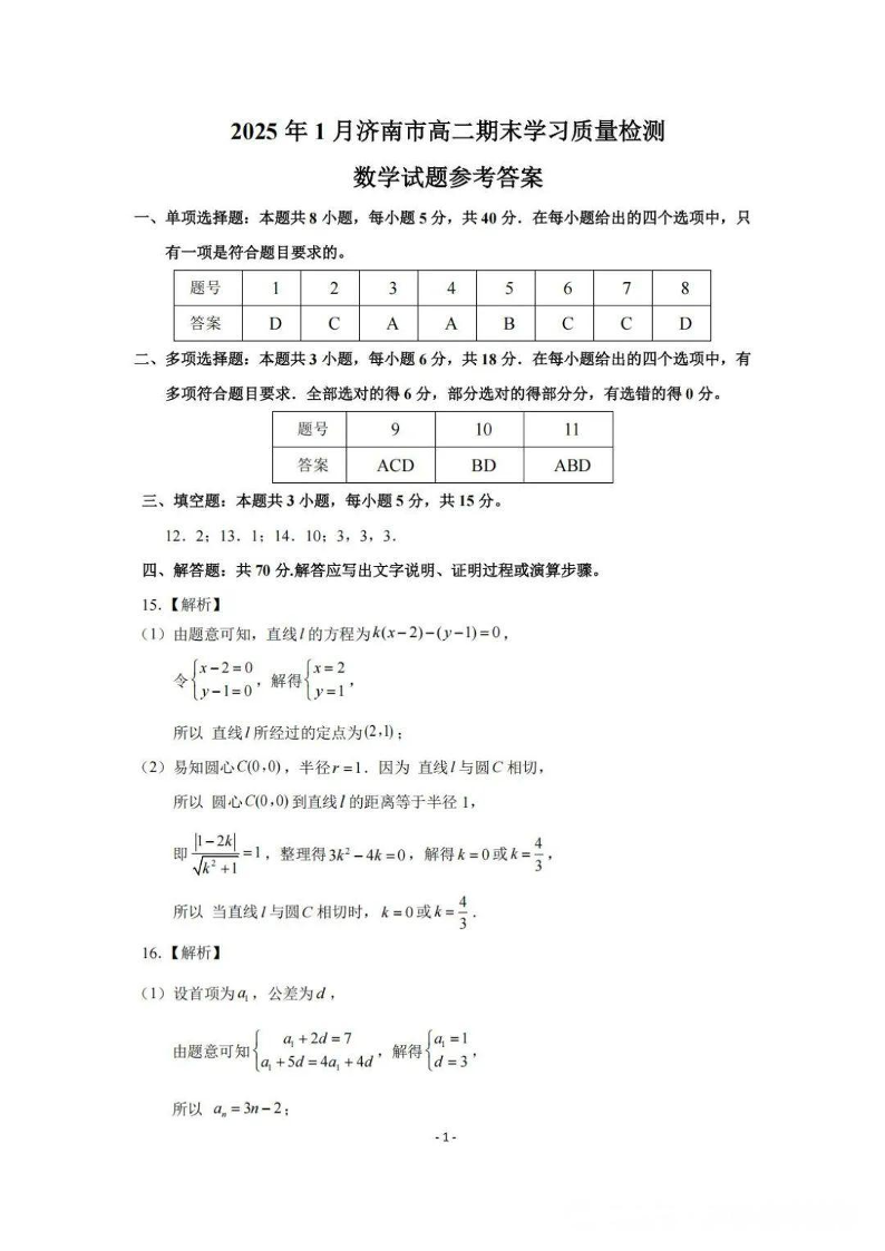 2025年1月济南市高二期末学习质量检测 数学答案.pdf