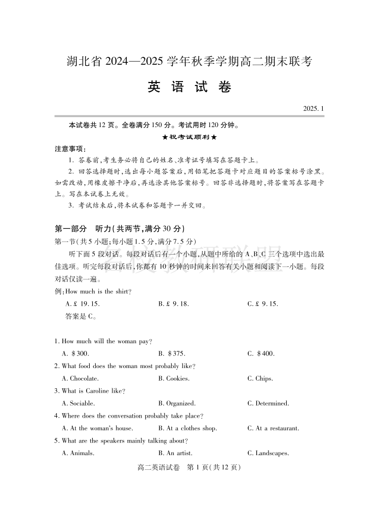 湖北省2024-2025学年高二上学期期末考试 英语.pdf