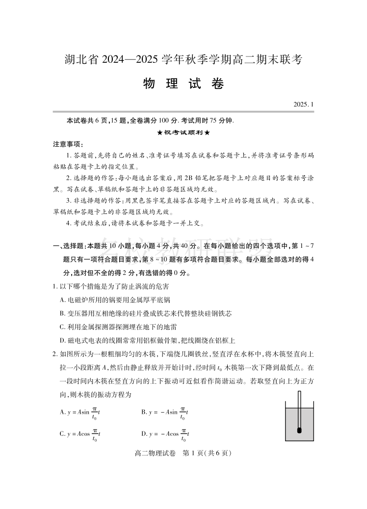 湖北省2024-2025学年高二上学期期末考试 物理.pdf