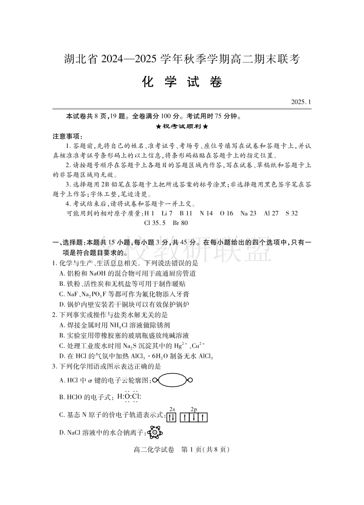 湖北省2024-2025学年高二上学期期末考试 化学.pdf