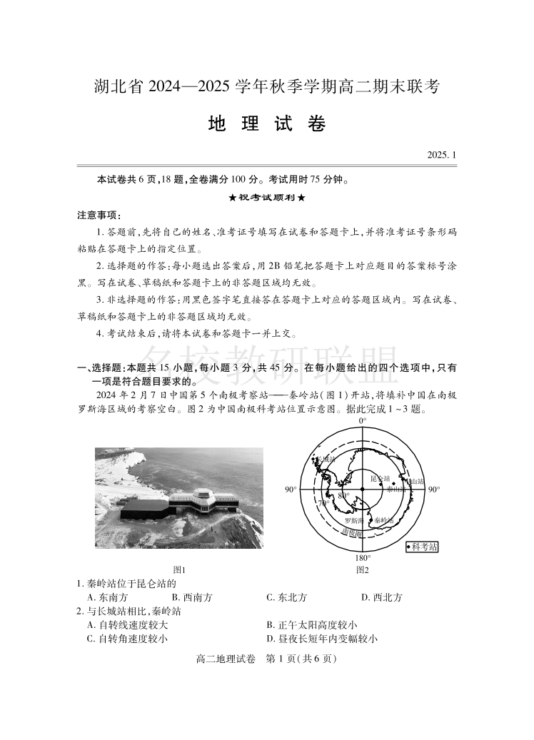 湖北省2024-2025学年高二上学期期末考试 地理.pdf
