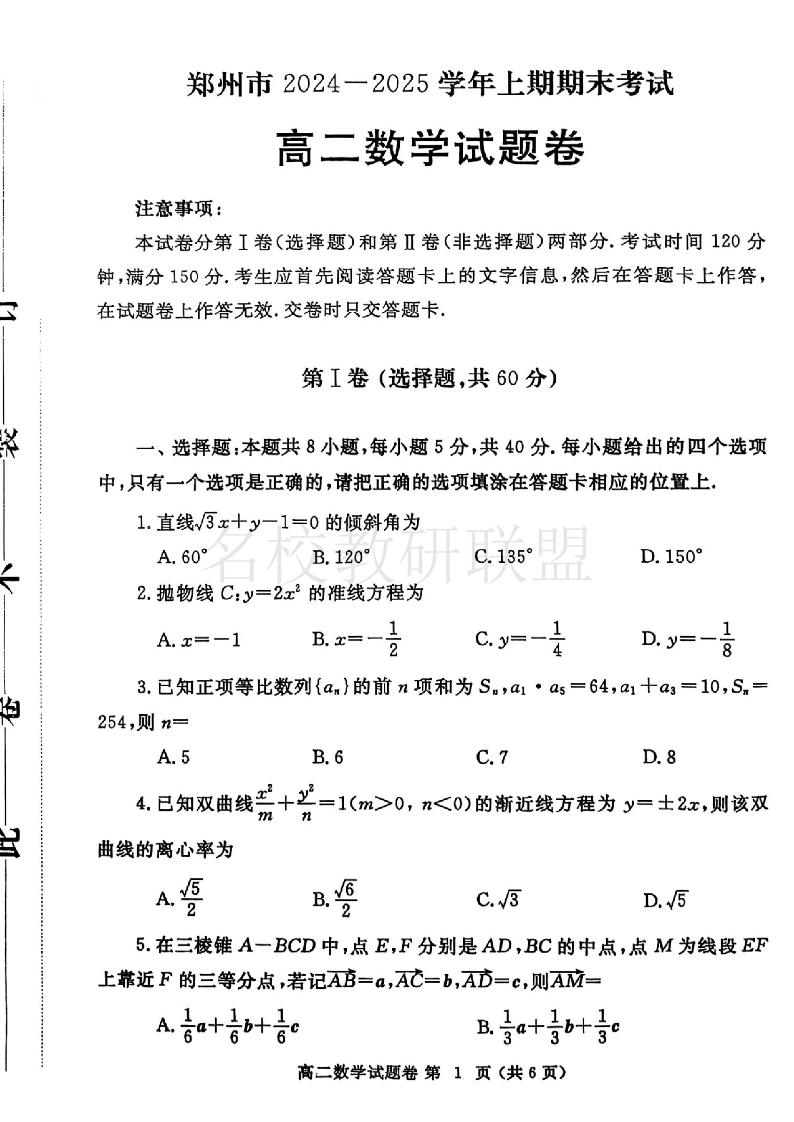 河南省郑州市2024-2025学年高二上学期期末考试 数学.pdf