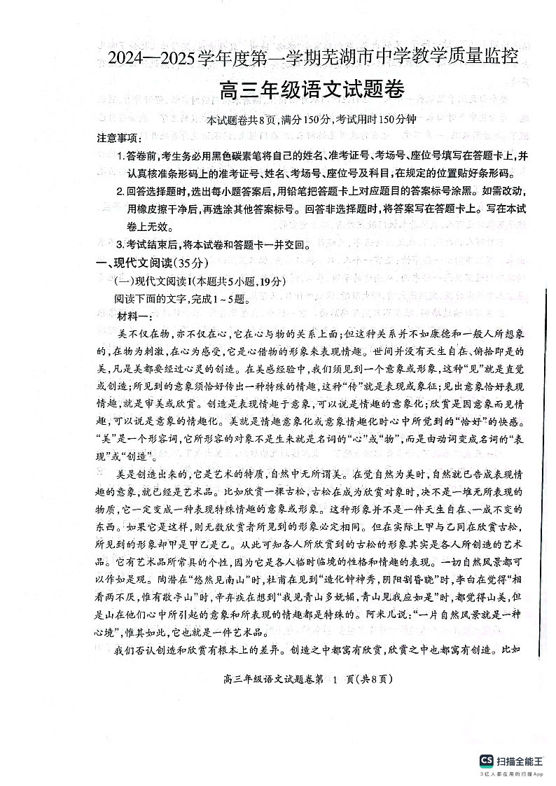 安徽省芜湖市2025届高三上学期1月期末考试 语文.pdf