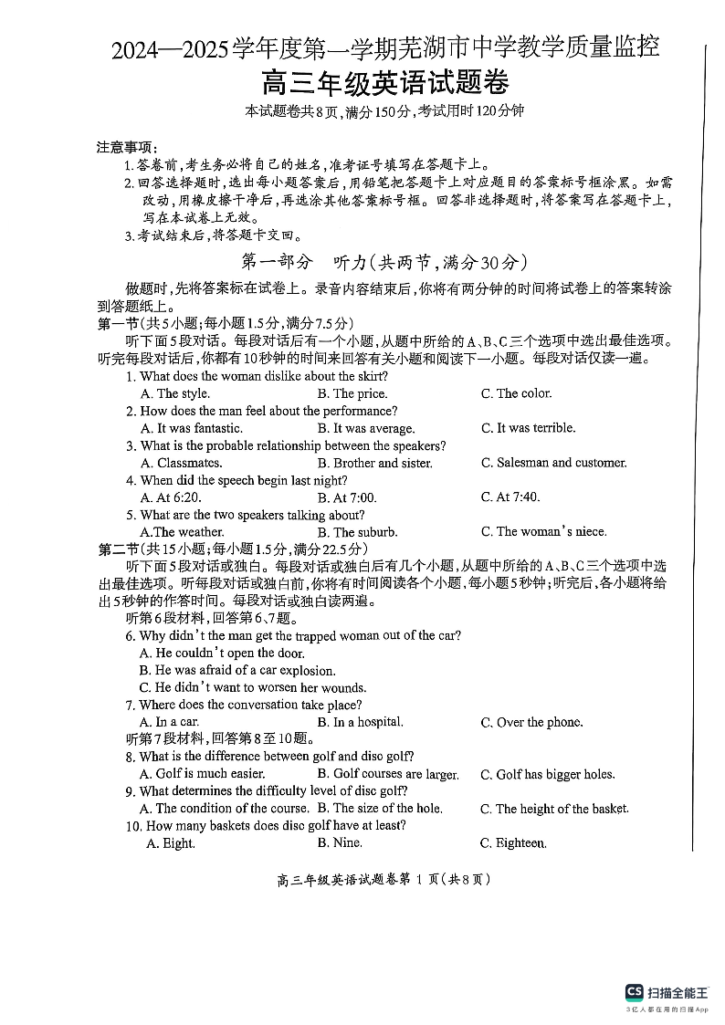 安徽省芜湖市2025届高三上学期1月期末考试 英语.pdf