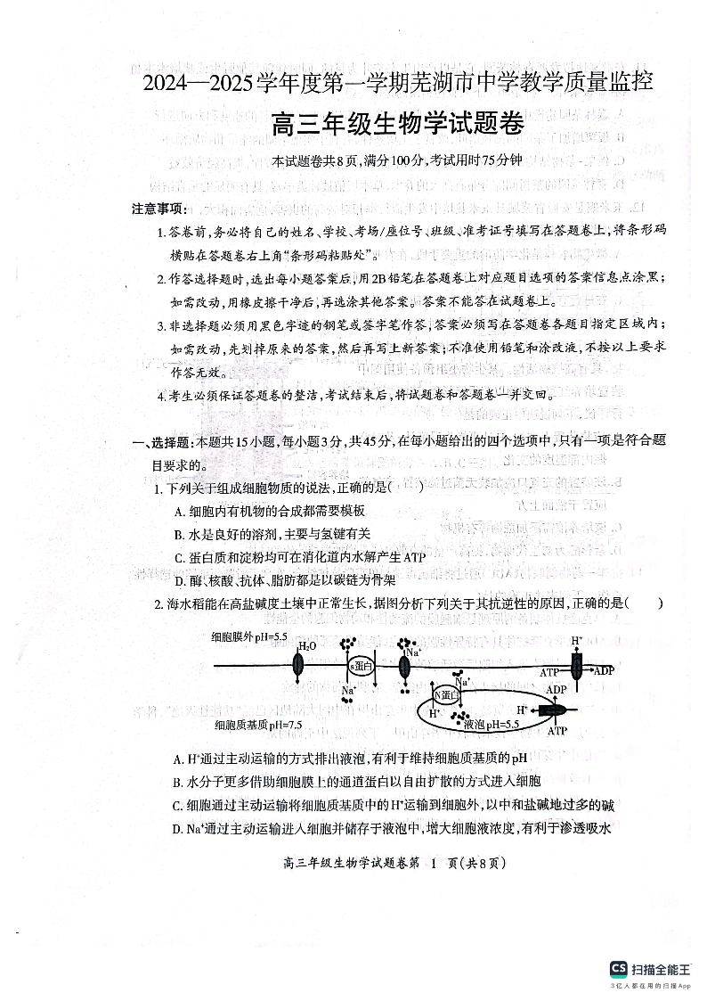 安徽省芜湖市2025届高三上学期1月期末考试 生物.pdf