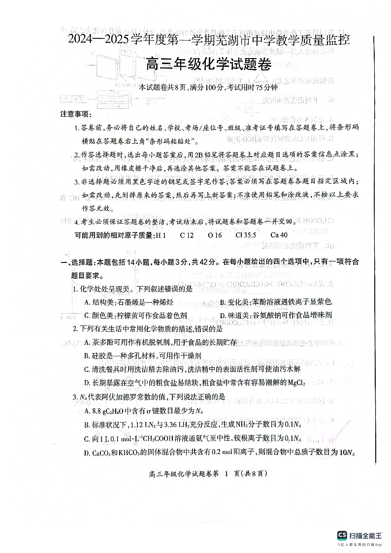 安徽省芜湖市2025届高三上学期1月期末考试 化学.pdf