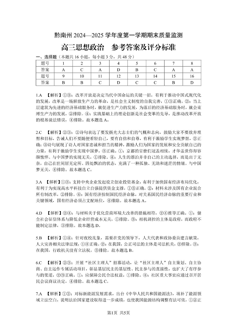 黔南州2024-2025学年度第一学期期末质量监测 政治答案.pdf