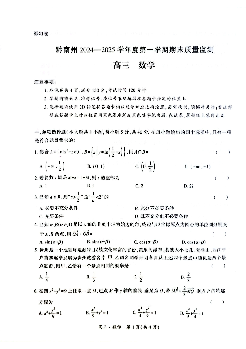黔南州2024-2025学年度第一学期期末质量监测 数学.pdf