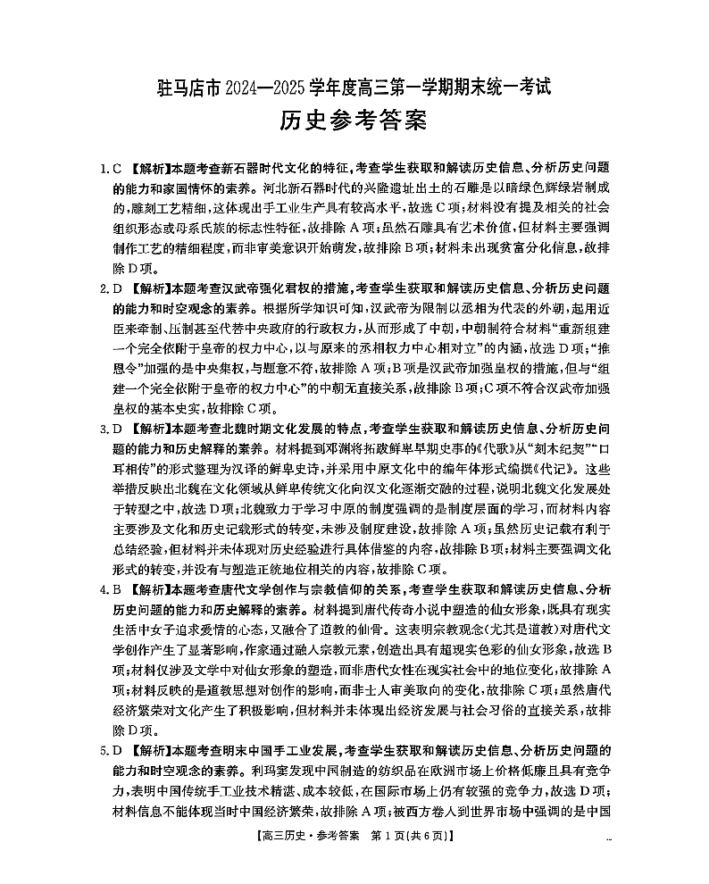 河南省驻马店市2025届高三1月期末联考 历史答案.pdf