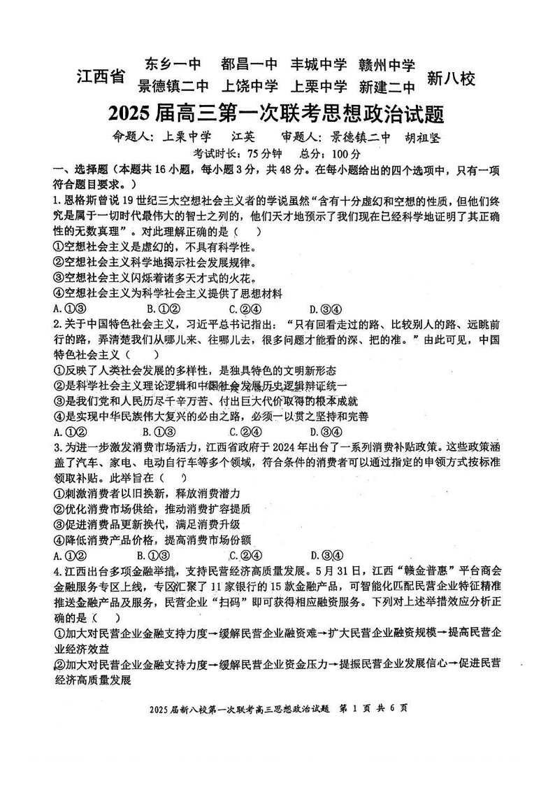 江西省新八校2025届高三第一次联考 政治.pdf