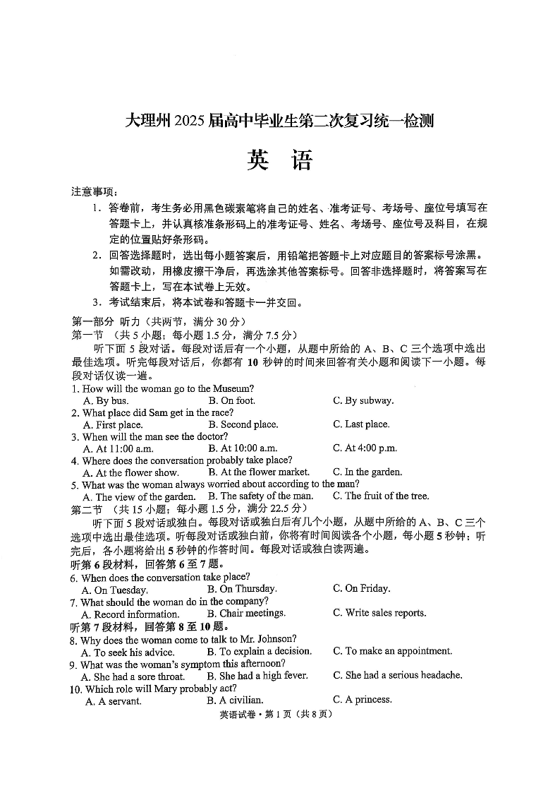 云南省大理州2025届高中毕业生第二次复习统一检测 英语.pdf