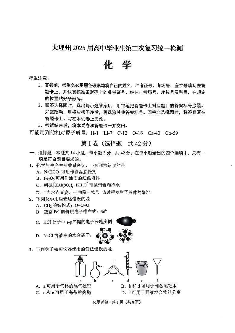 云南省大理州2025届高中毕业生第二次复习统一检测 化学.pdf