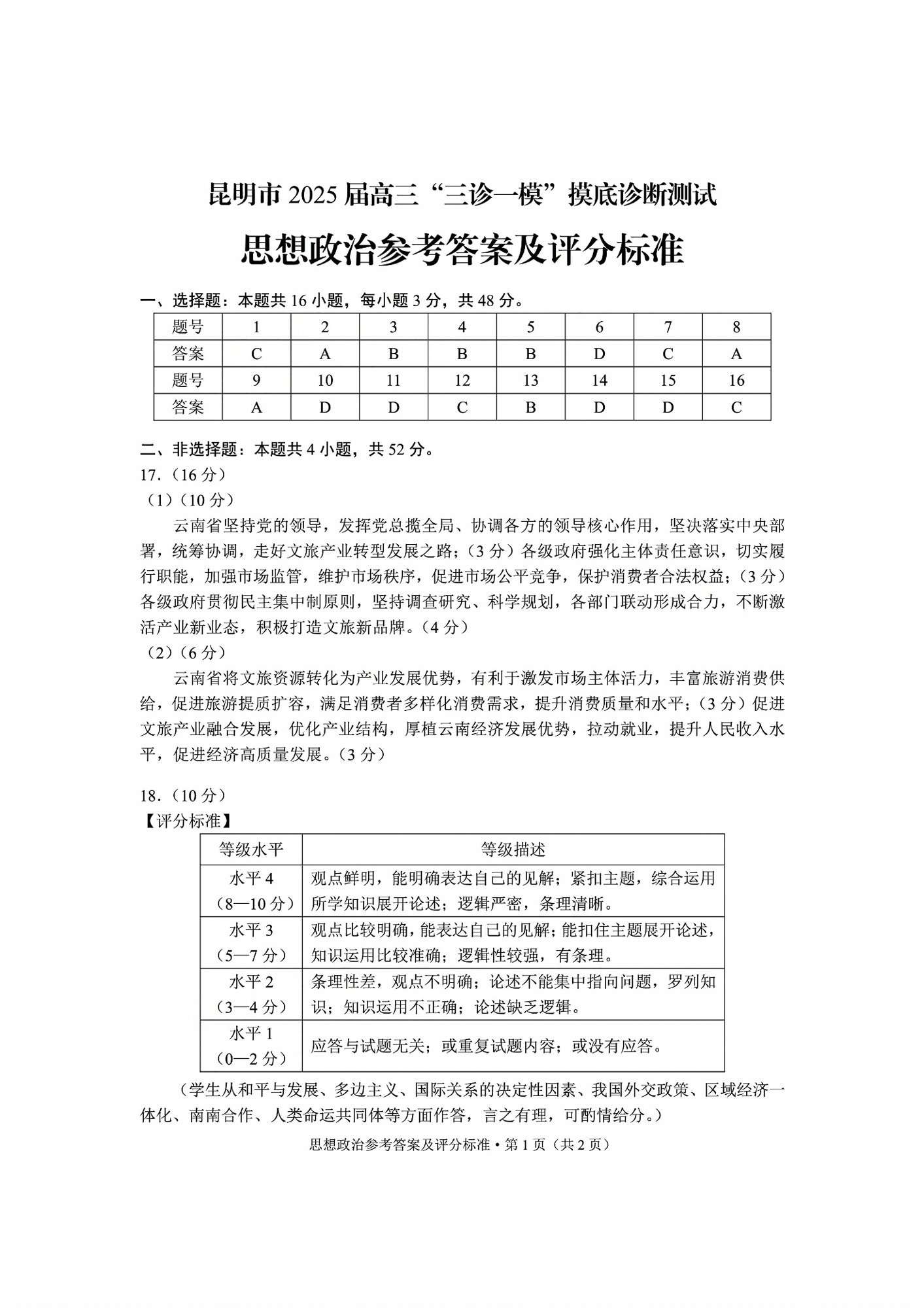 云南省昆明市2025届高三“三诊一模”摸底诊断测试 政治答案.pdf