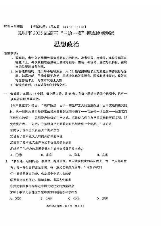 云南省昆明市2025届高三“三诊一模”摸底诊断测试 政治.pdf