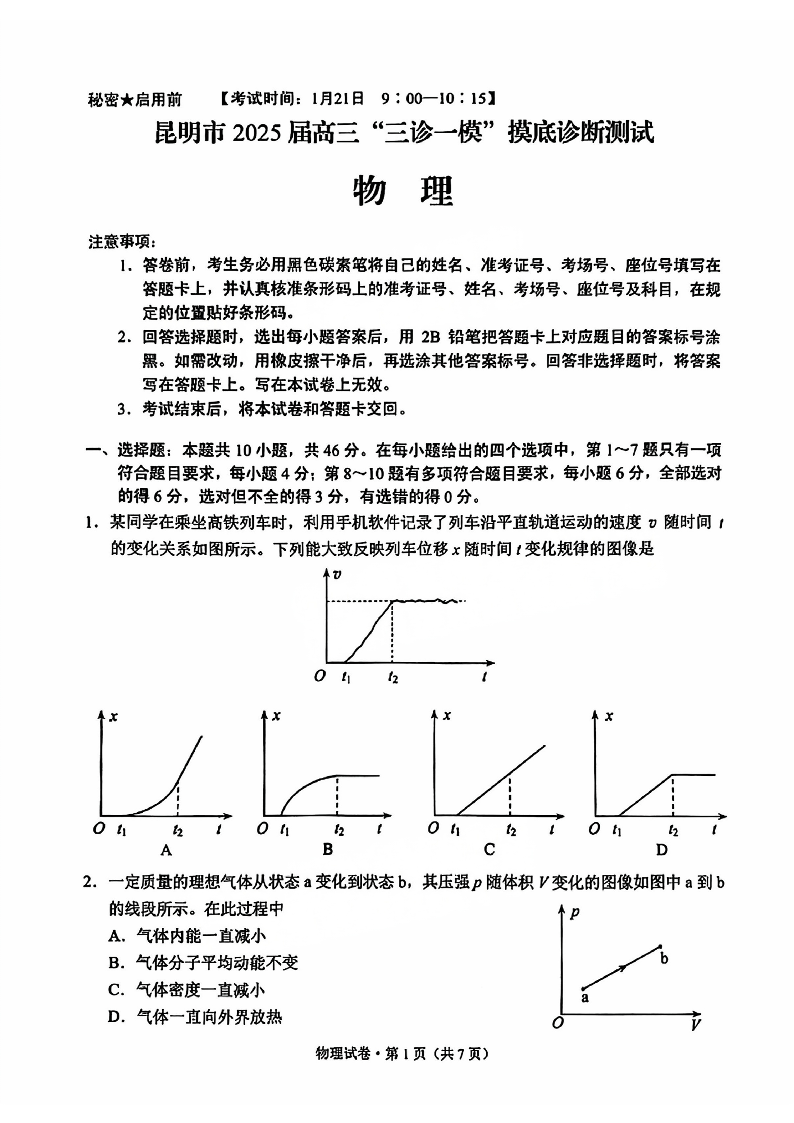云南省昆明市2025届高三“三诊一模”摸底诊断测试 物理.pdf