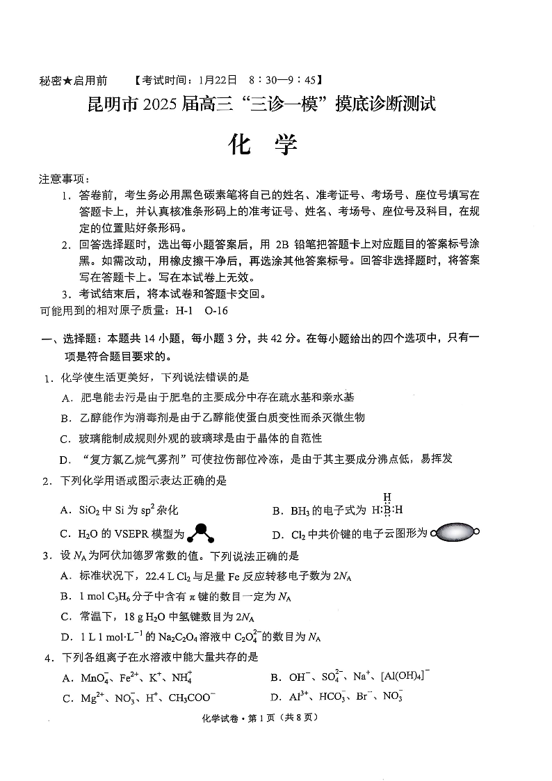 云南省昆明市2025届高三“三诊一模”摸底诊断测试 化学.pdf