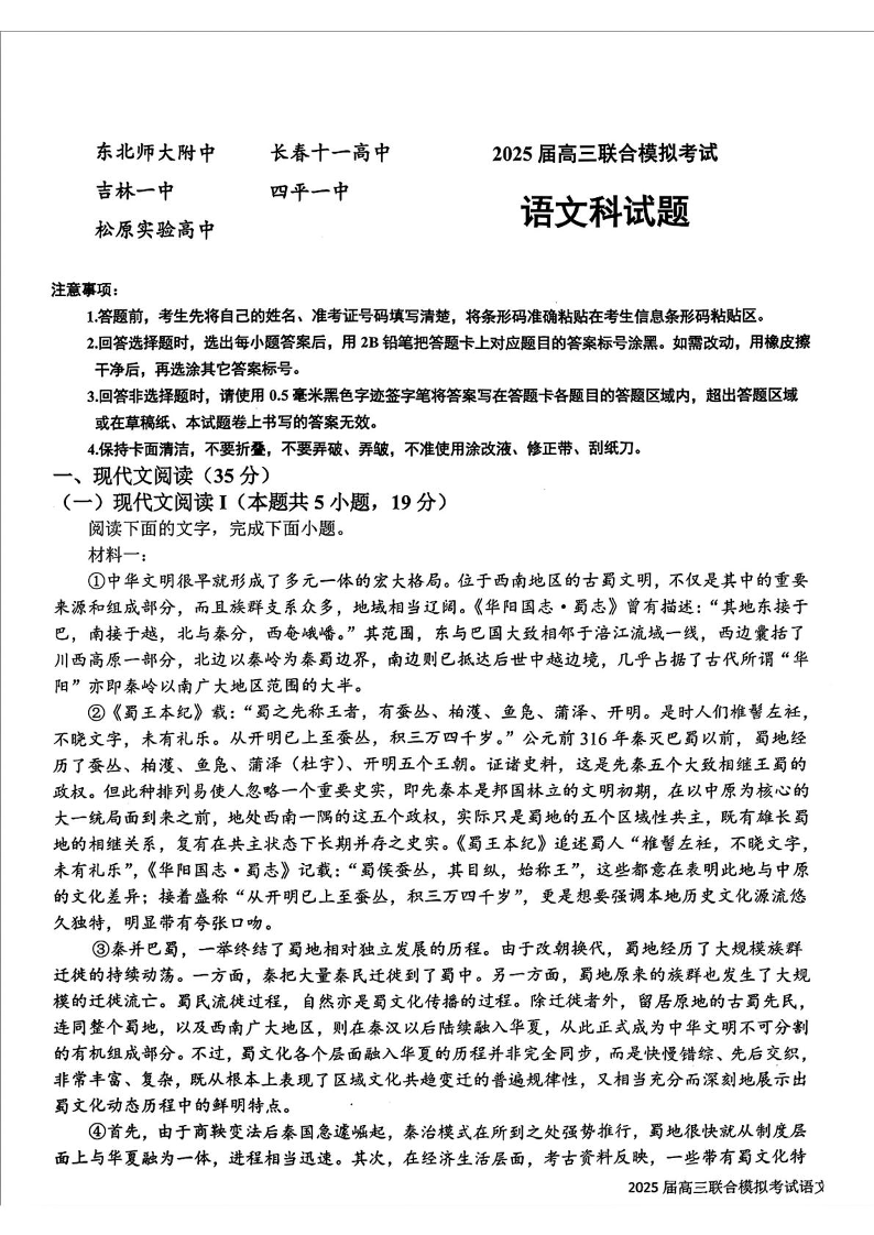 东北师大附中等五校2025届高三上学期期末考试 语文.pdf