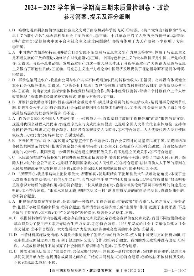 山西省三晋卓越联盟2025届高三上学期期末质量检测 政治答案.pdf