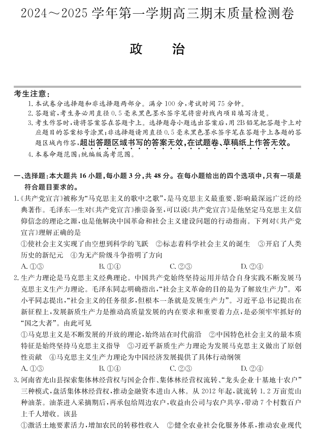 山西省三晋卓越联盟2025届高三上学期期末质量检测 政治.pdf